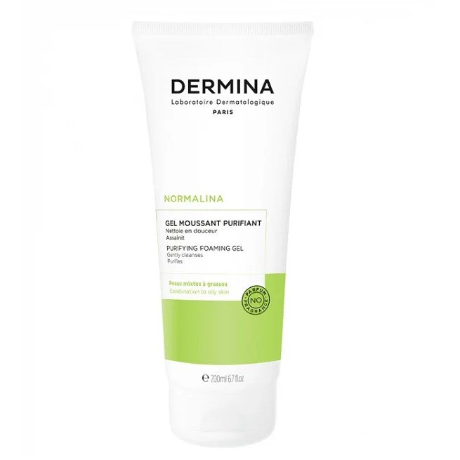 Le Gel moussant de DERMINA, spécialement formulé pour les peaux normales à mixtes, nettoie en douceur.